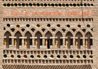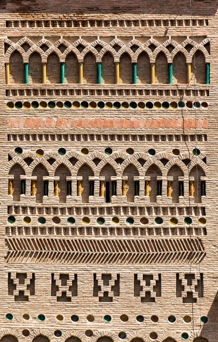 Fue construida para ser vista por sus cuatro lados, pues todos ellos llevan decoración (cenefas de ladrillo resaltado formando motivos variados, algunos de origen antiquísimo; y piezas de cerámica vidriada en fustes de columnas y ataifores en colores verde y melado).