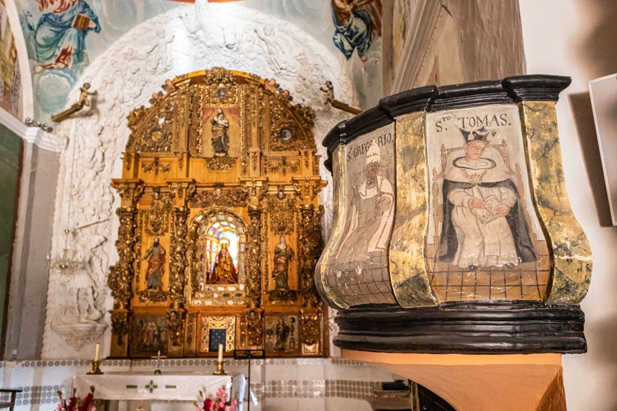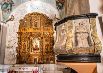 La decoración de las bóvedas fue realizada imitando yeserías de clara inspiración serliana en una composición de forma y color muy similar a la realizada en el Santuario de la Virgen de la Peña de Calatayud. Está presidida por un monumental retablo barroco restaurado recientemente.