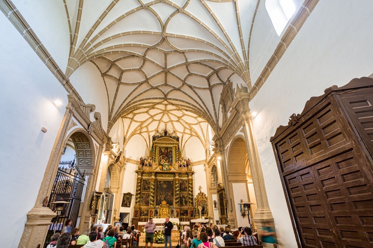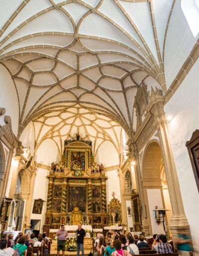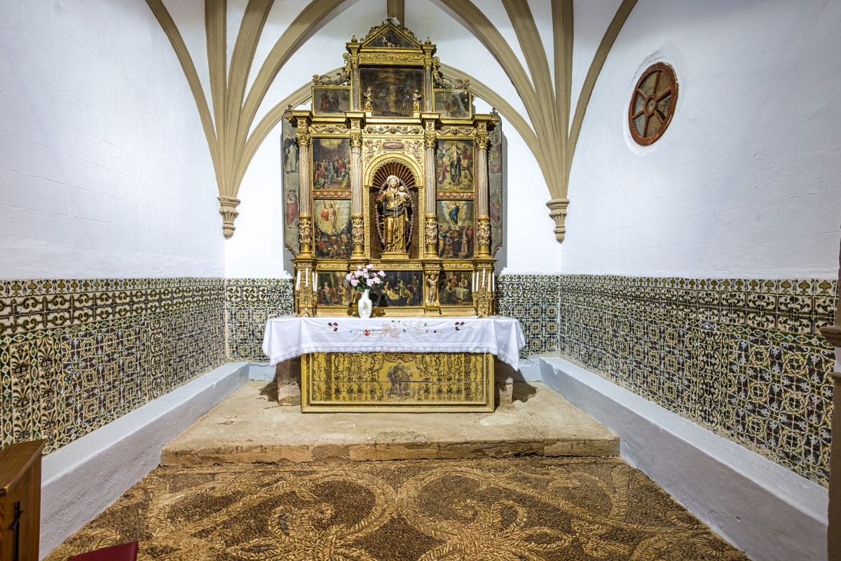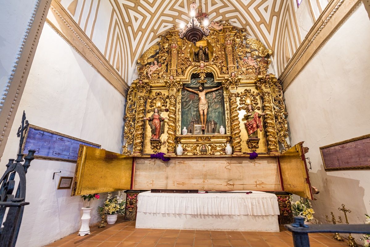 En su interior presenta una única y espaciosa nave de tres tramos y cabecera poligonal cubiertos por bóvedas de crucería estrellada. A ambos lados de la nave se abrieron posteriormente dos capillas; se accede a su interior mediante arcos de medio punto y algunas presentan portadas labradas en yeso y piedra. El templo está presidido por un soberbio retablo barroco en el que en su ático campean las cruces de Malta, emblema de la orden y de los señores temporales de la localidad.