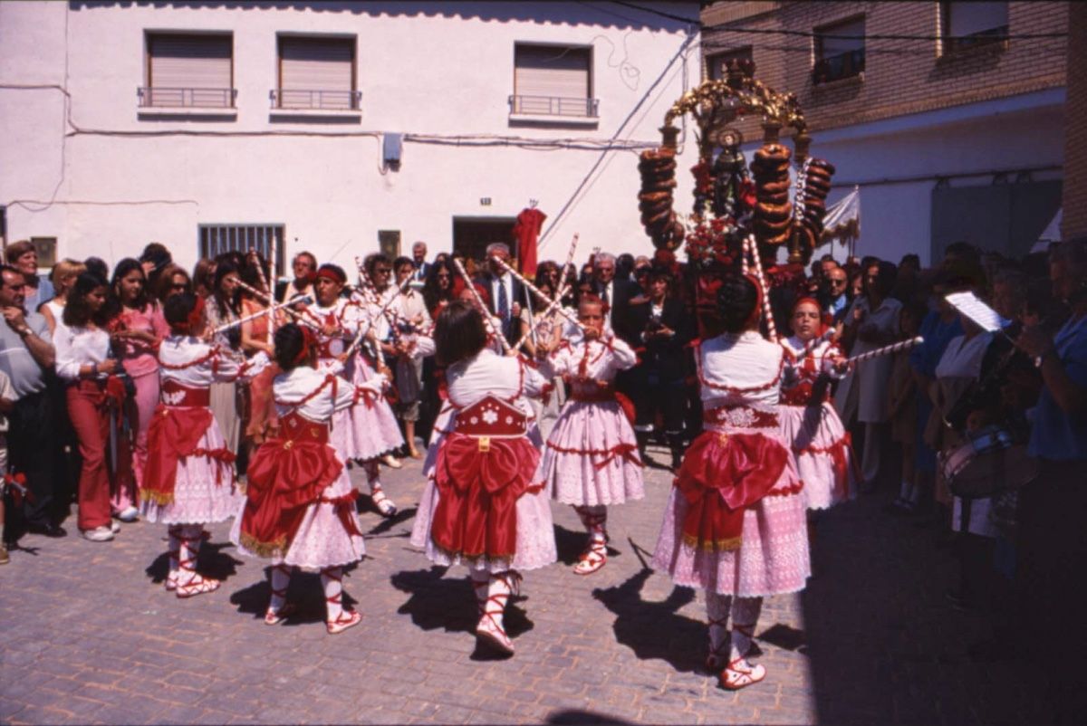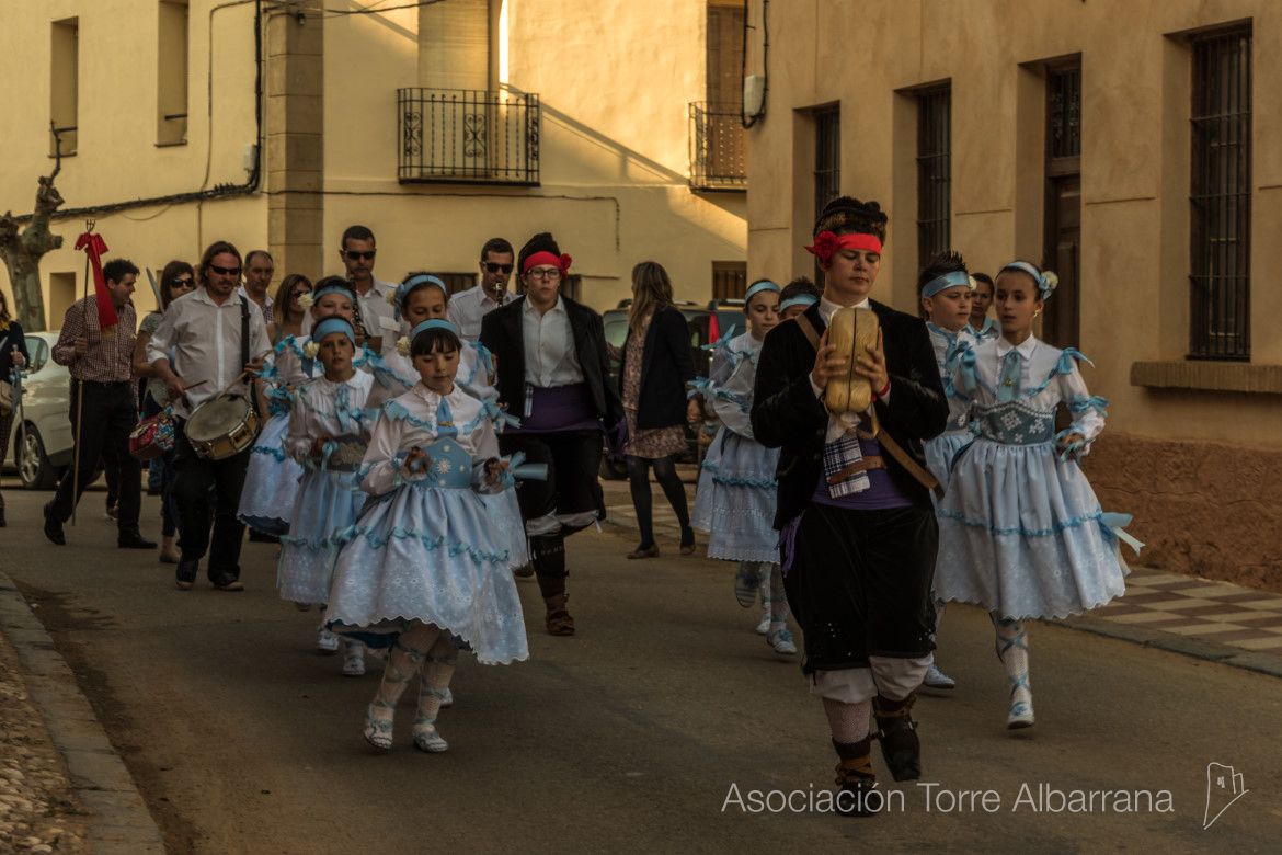 El "Mayoral" y "Zagal" llevan montera de piel de cordero y debajo de esta un pañuelo rojo de seda atado a la cabeza, con una rosa natural roja al lado izquierdo; el traje es similar al tradicional aragonés, con camisa blanca, calzón corto y medias blancas de algodón. El "Mayoral" lleva una gran castañuela colgada de su hombro derecho y el "Zagal" una "gayata" o cayado. Los danzantes, niños de 10 a 12 años, llevan pañuelo a la cabeza con rosa natural, saya blanca adornada con cintas, lazos y puntillas, un fajín o peto, medias de algodón blancas, alpargatas "miñoneras", dos enaguas blancas almidonadas, un transparente, etc. El 18 de mayo, día de la víspera de la fiesta, llevan el pañuelo, cintas, lazo y transparente de color azul y el 19 de mayo de color rojo.