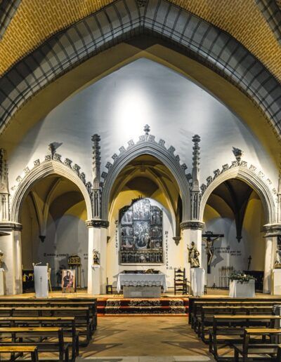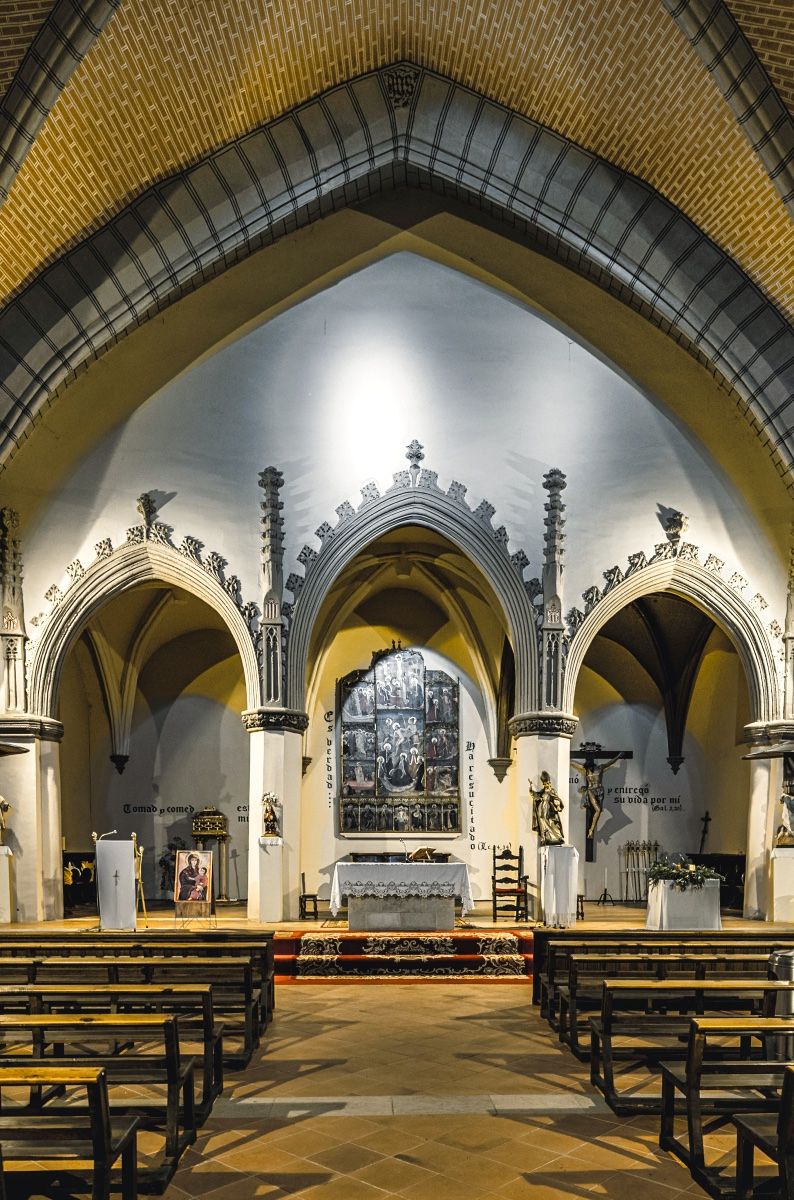 El interior se distribuye en una sola nave de dos tramos cubiertos de crucerĂa sencilla. Las capillas laterales, alojadas entre los contrafuertes, se abovedan tambiĂ©n con el mismo tipo de crucerĂa. Las tres capillas que forman el presbiterio se abren a la nave central por arcos apuntados siendo el central de mayor tamaño que los laterales.Â