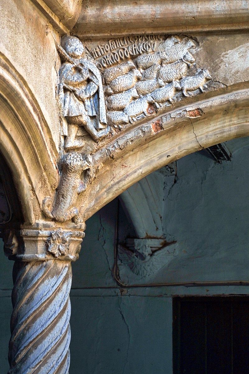 Es en el interior, hoy en malas condiciones, donde se abre un magnífico patio columnado con dos cuerpos, las del piso bajo de orden toscano y las del superior decoradas con yeserías. Los adornos en yeso alcanzan las cuatro esquinas, en las que se representan pasajes de la vida del santo, como la que está con su ganado, en la que hay una inscripción en caracteres góticos de difícil lectura. El uso del edificio fue el de hospital de peregrinos en el que se alojaban quienes visitaban las reliquias de San Millán. Declarado BIC en 2001, espera desde entonces su oportunidad para ser restaurado y puesto en uso.