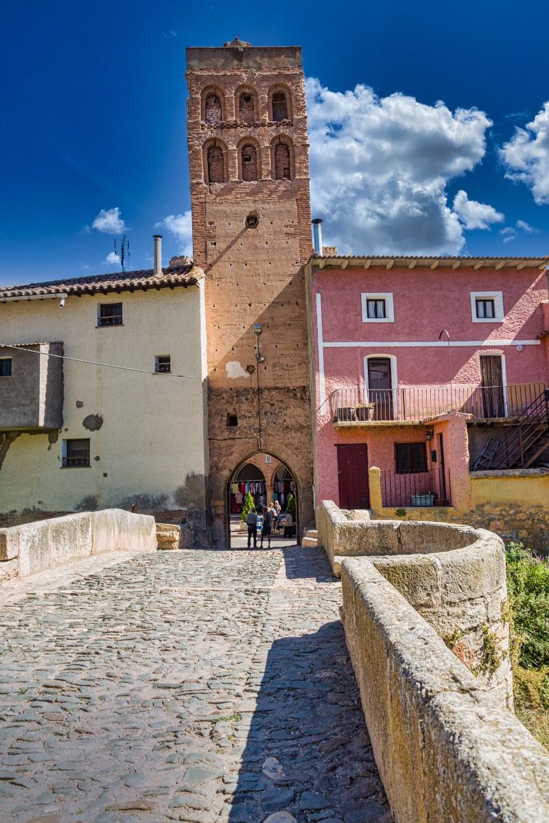La puerta torreón formaba parte de la desaparecida muralla que protegía la población y cuya función era controlar el acceso desde el puente sobre el río Manubles. Su origen medieval se remonta a la Guerra de los Dos Pedros, durante la cual el valle del Manubles sufrió los avatares de los continuos enfrentamientos con Castilla. La construcción original, realizada en piedra y tapial, fue ampliada con los dos pisos de arquerías renacentistas en ladrillo que coronan la torre. Desde la puerta de arco apuntado se accede al bello puente construido en piedra sillar con dos arcos y tajamares circulares.
