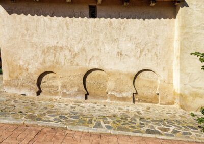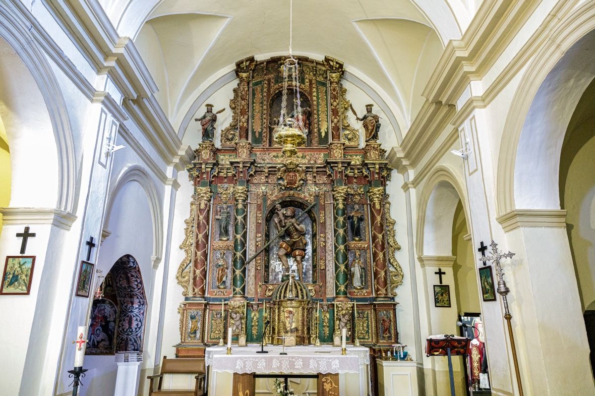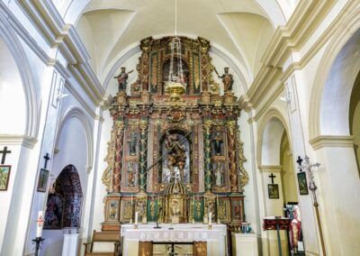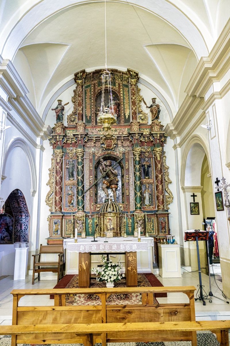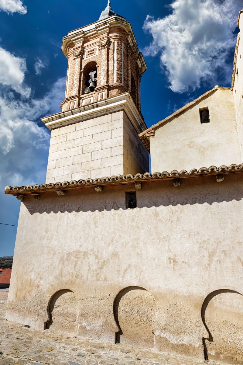 Lo destacable de esta iglesia es que se conservan los restos de la antigua mezquita sobre la que se construyó; son los restos de una torre sencilla y solo decorada con ataifores, en cuyo interior está la capilla de San Bartolomé, y unos arcos de herradura cegados en el muro de la cabecera que, según algunos estudiosos, corresponderían a los restos de una mezquita no anterior al último tercio del siglo X.